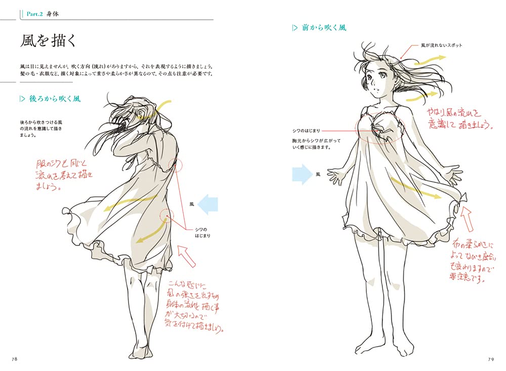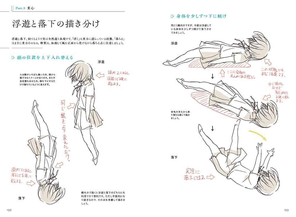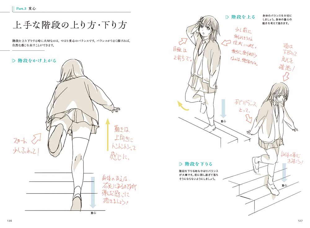 The author, who is also an animator, explains techniques for drawing dynamic characters using a red pen method.