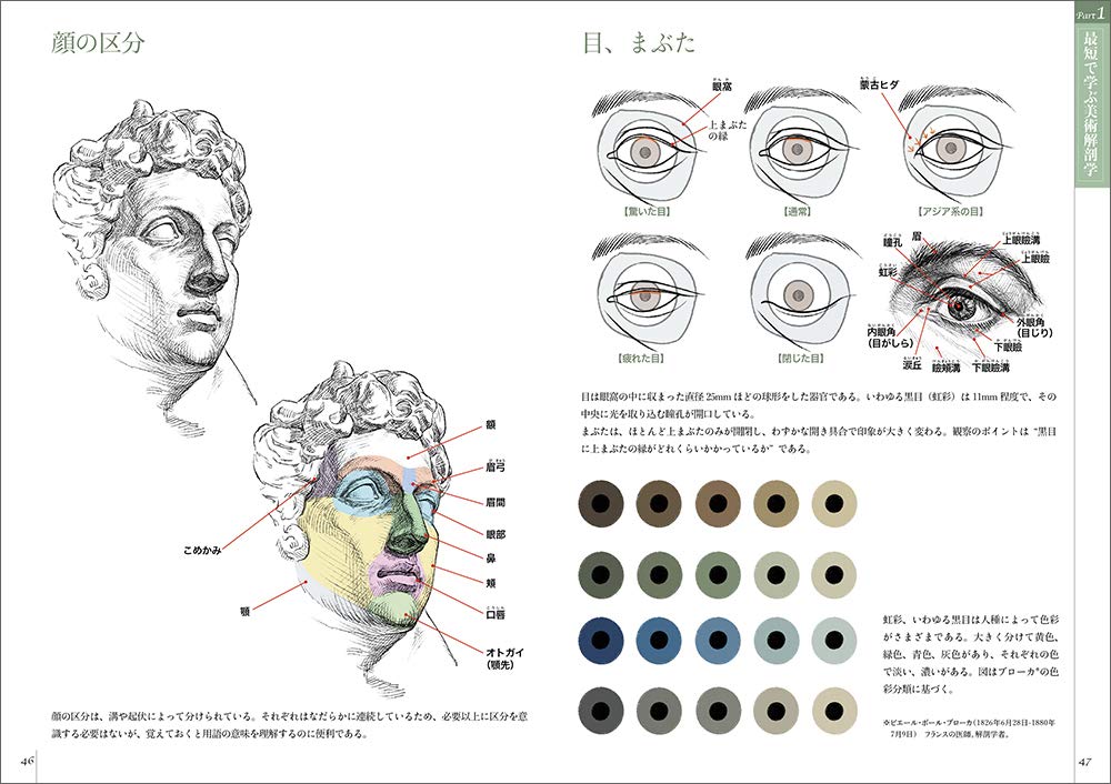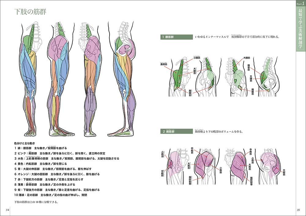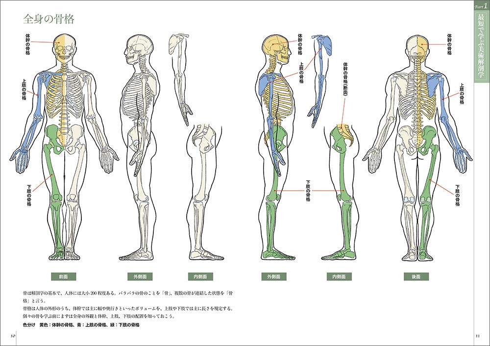 PART 1 summarizes the content necessary for art anatomy in 42 pages. When learning about the skeleton, instead of explaining the names of all parts, we focus only on the main parts that can be seen from the body surface. The color-coded muscle diagram organizes the 43 muscles that make up the upper limbs into nine muscle groups, greatly reducing the learning load.