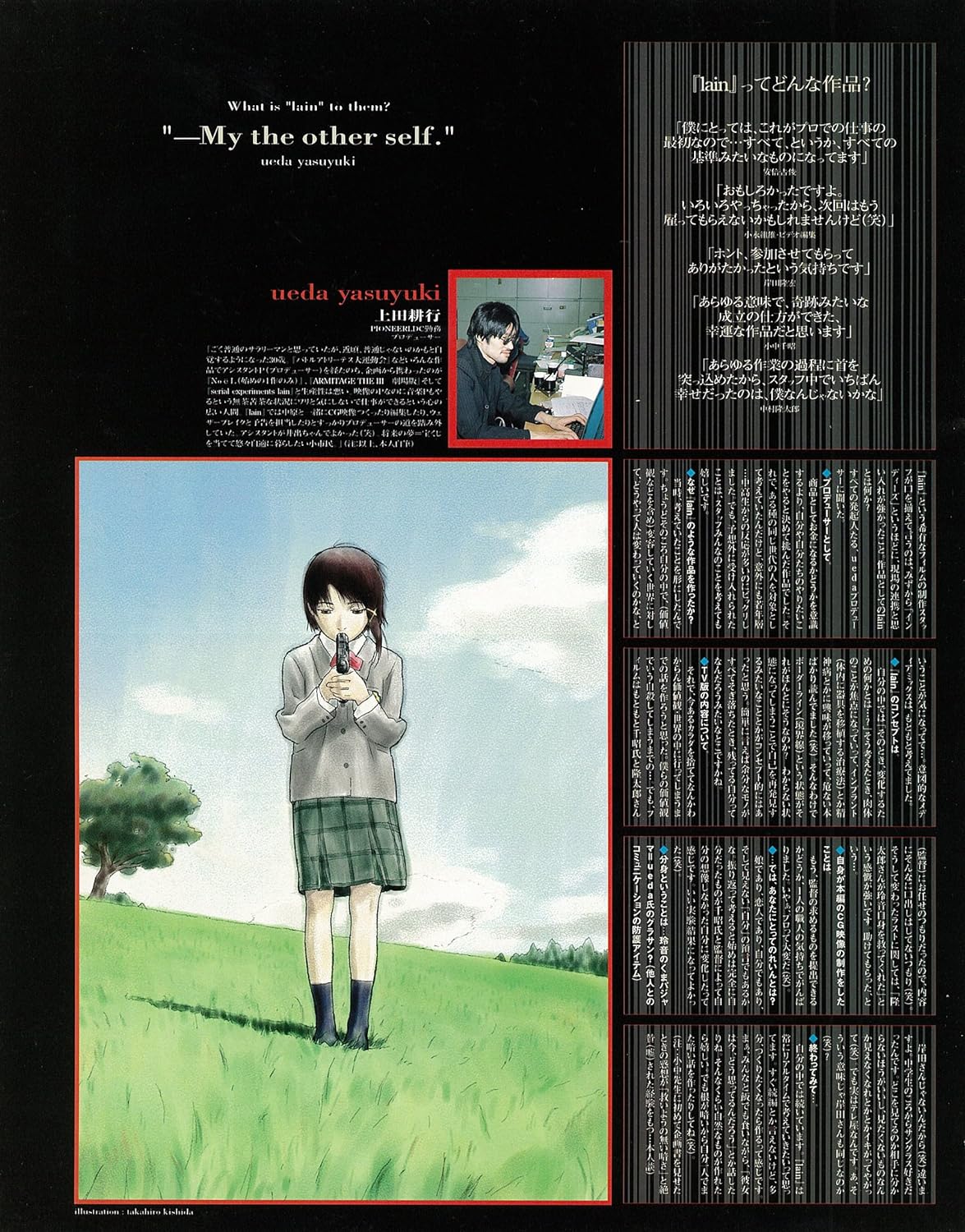 ?? Main contents: ?gWhat is ?glain?h?c??h = Introducing the view of lain by Mr. Chiaki Konaka, producer Koyuki Ueda and other staff / ?gStory & Data?h = layer:01-13 content introduction and data. Also includes valuable visuals such as scene cuts, setting images, and original drawings/"Device#'' = Packed with interviews, images, graphics, etc. of Rain's voice actor Kaori Shimizu, etc.