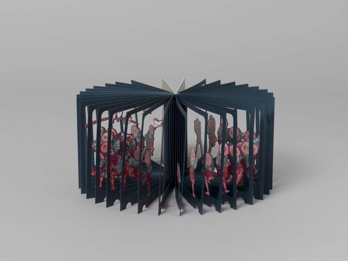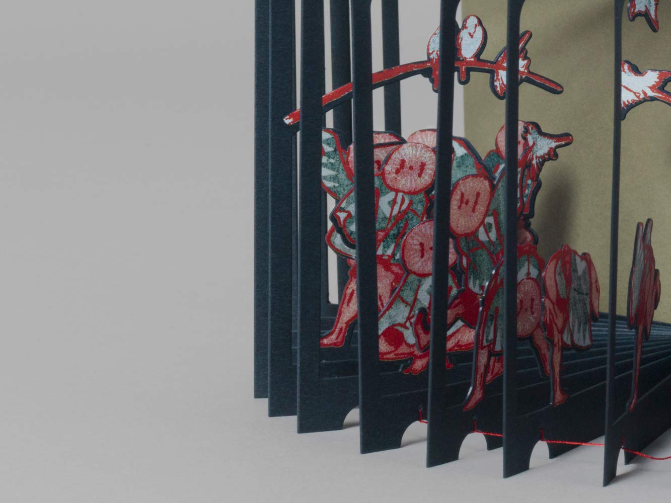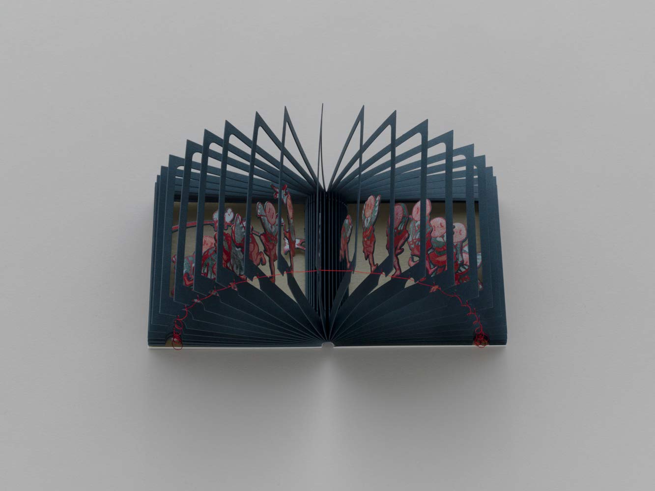 The series of delicately cut pages invites the viewer from a two-dimensional to a three-dimensional world.